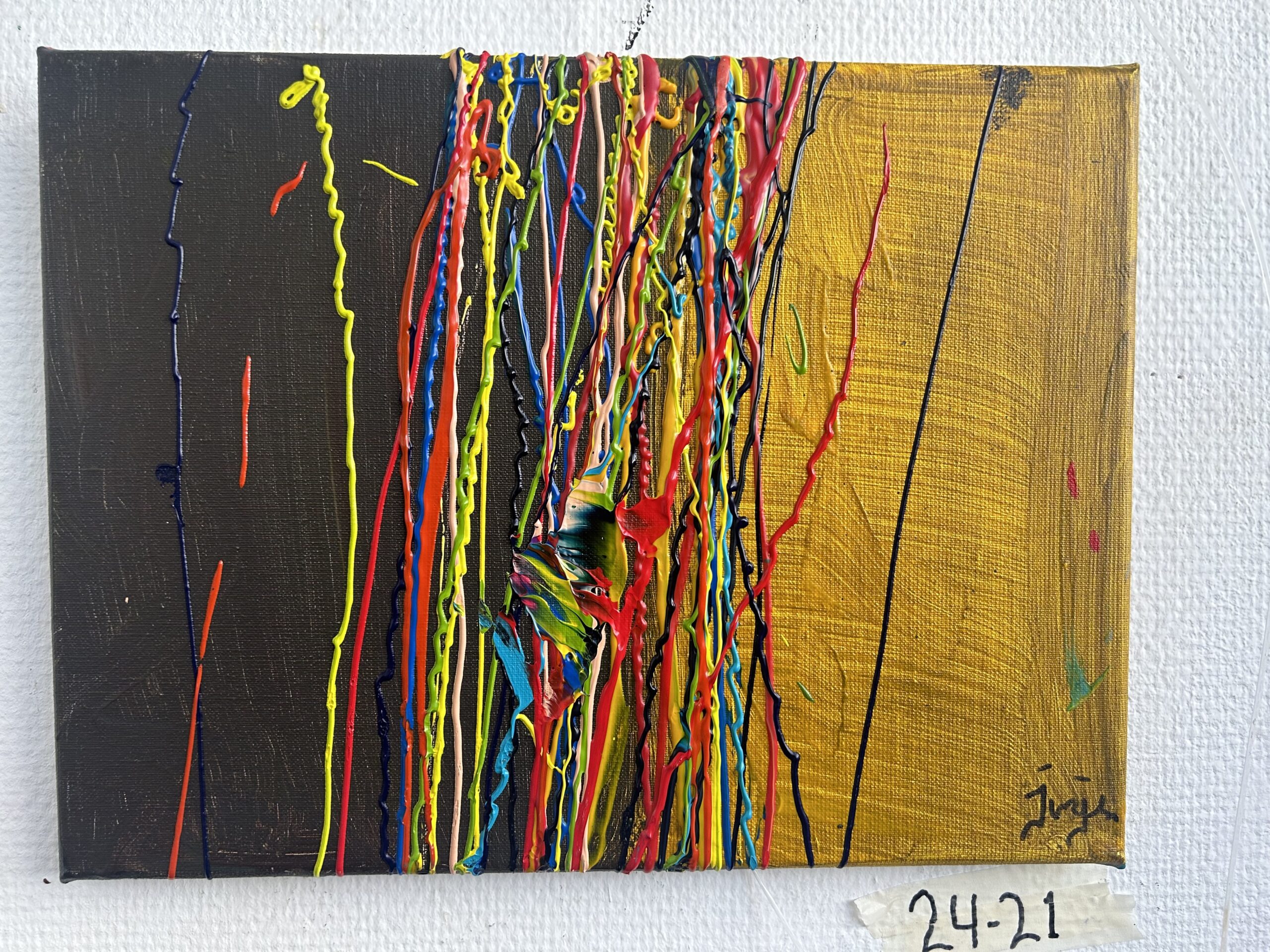 Dit schilderij is een krachtig samenspel van contrast en beweging. De donkere linkerhelft wordt doorkliefd door felgekleurde, druipende lijnen die als elektrische energie naar de gouden rechterzijde stromen. De verf is dik en dynamisch aangebracht, waardoor de lijnen niet slechts visueel, maar ook fysiek aanwezig zijn. In het midden lijkt een explosie of breukpunt te ontstaan, een plek waar kleuren samenkomen, botsen en zich opnieuw vormen.