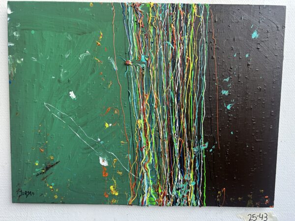De verticale lijnen in felle kleuren lijken als energiebanen tussen twee werelden in te hangen: het open, levendige groen aan de ene kant en het donkere, gesloten vlak aan de andere. Het werk ademt spanning, maar ook verbinding — alsof het leven zich altijd beweegt op de grens van licht en donker, chaos en orde. Hier wordt de overgang zichtbaar gemaakt, de plek waar nieuwe energie ontstaat.
